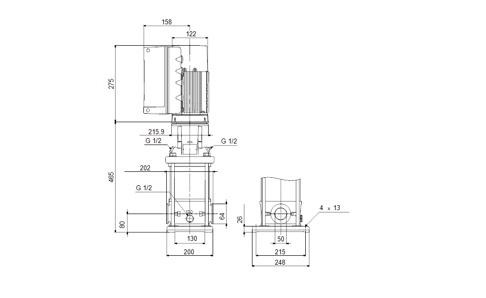 CRNE 10-4 A-CX-A-E-HQQE Vertical, multistage centrifugal pump with inlet and outlet ports on same the level (inline). Pump materials in contact with the liquid are in high-grade stainless steel. A cartridge shaft seal ensures high reliability, safe handling, and easy access and service. Power transmission is via a rigid split coupling. Pipe connection is via Tri-Clamps. The pump is fitted with a 3-phase, fan-cooled, permanent-magnet, synchronous motor. The motor efficiency is classified as IE5 in accordance with IEC 60034-30-2. The motor includes a frequency converter and PI controller in the motor terminal box. This enables continuously variable control of the motor speed, which again enables adaptation of the performance to a given requirement. An operating panel on the motor terminal box enables setting of required setpoint as well as setting of pump to "Min. " or "Max. " operation or to "Stop". The Grundfos Eye indicator on the operating panel provides visual indication of pump status: "Power on": Motor is running (rotating green indicator lights) or not running (permanently green indicator lights)